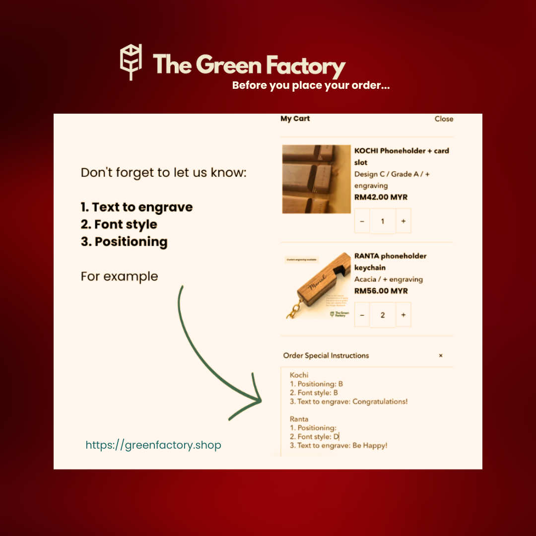 For bulk orders, email hello@greenfactory.shop or WhatsApp +60 18-323 2004.