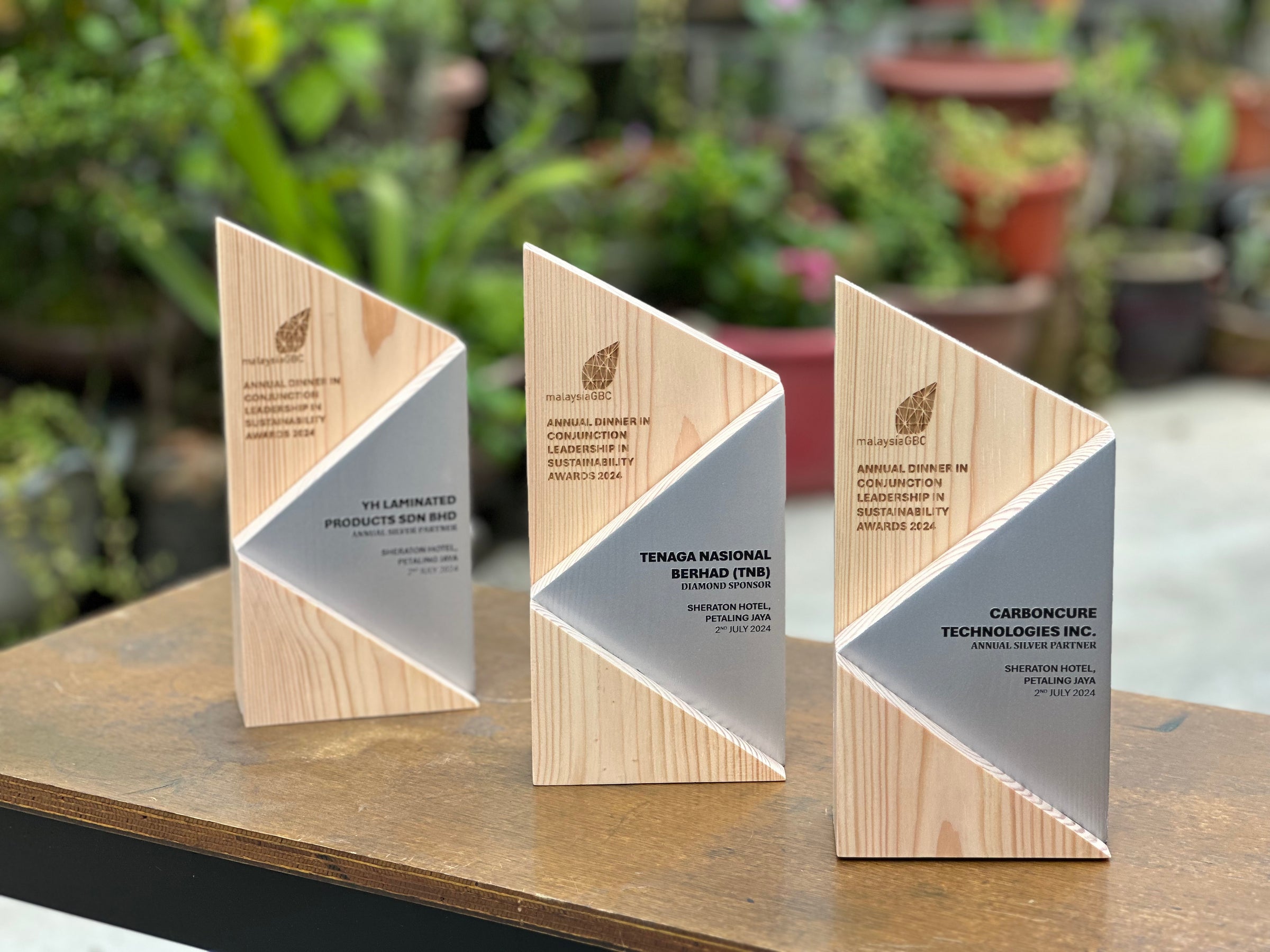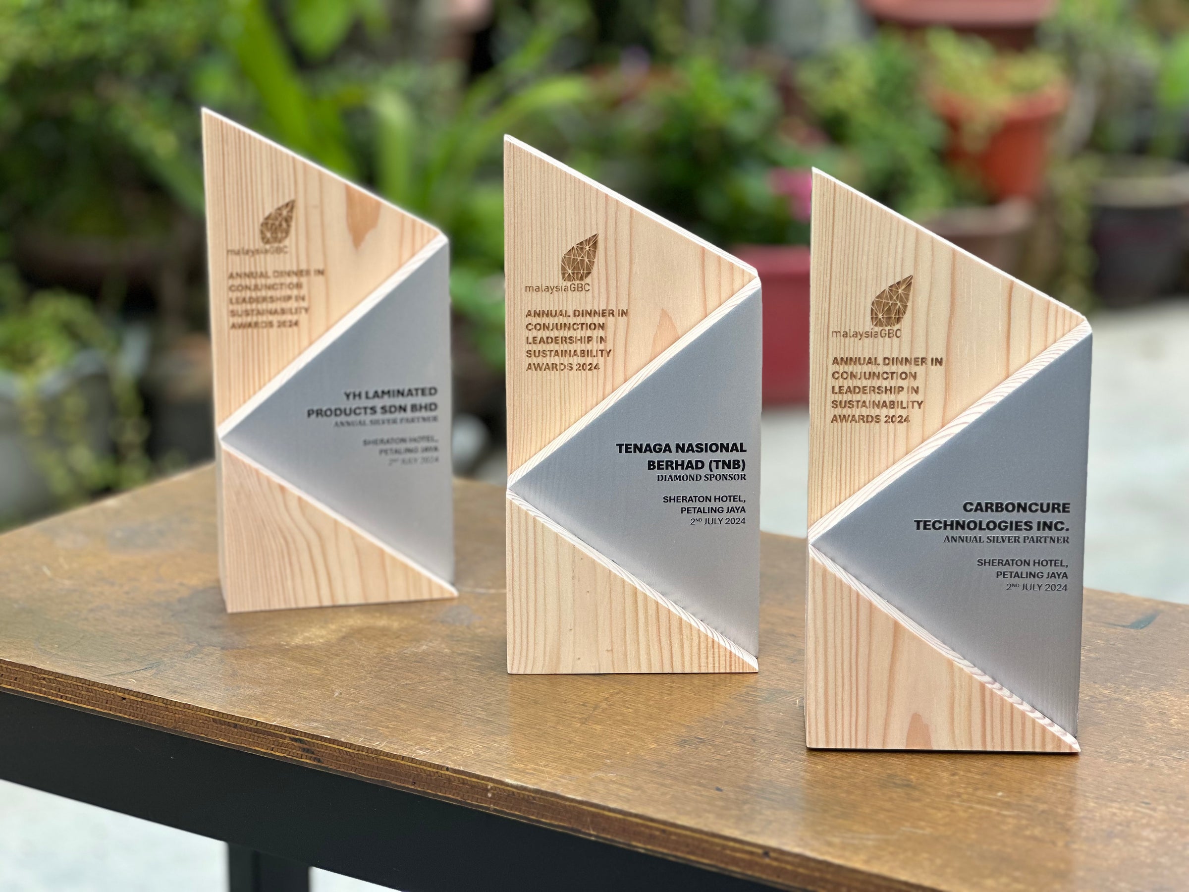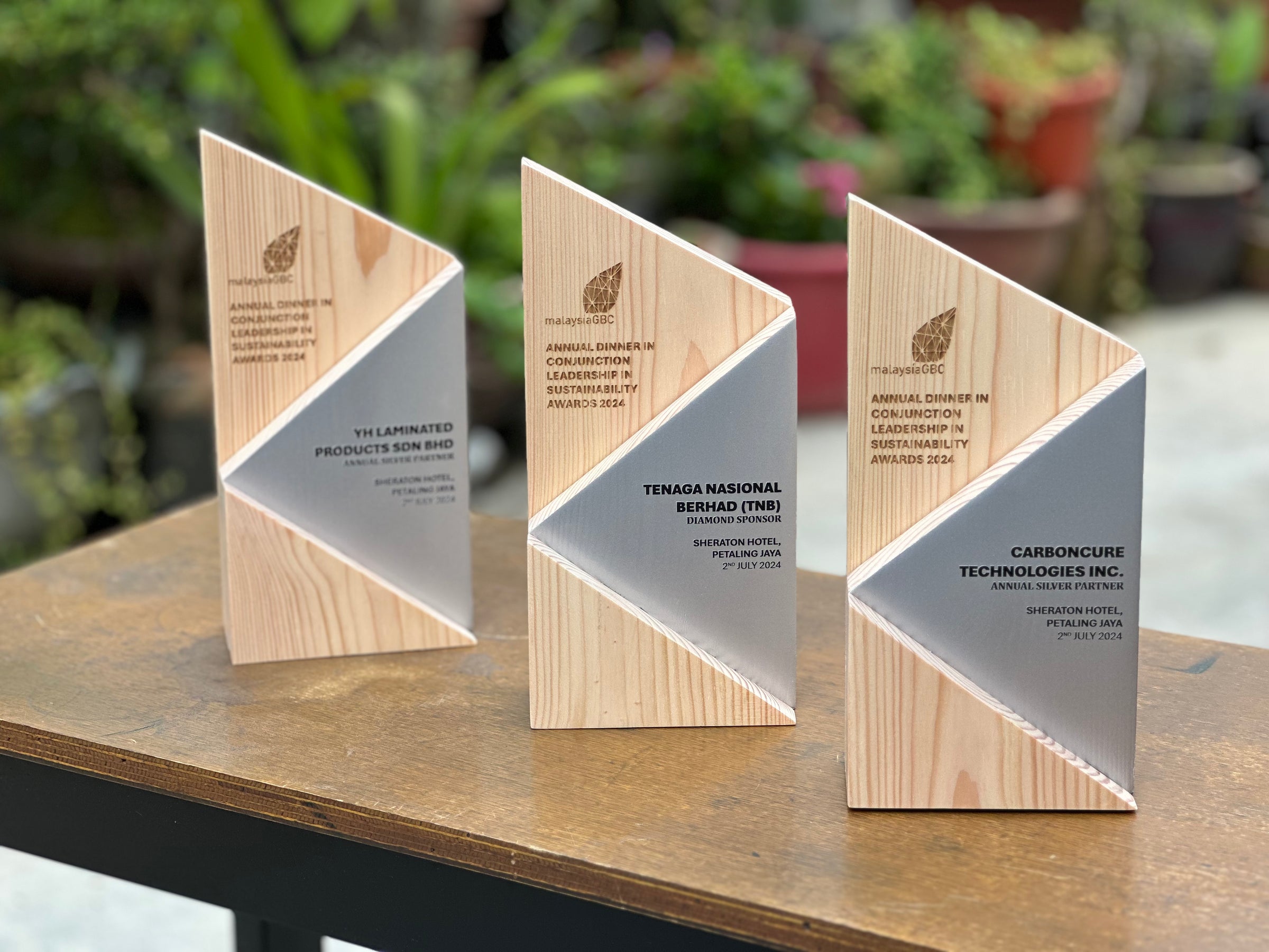 A geometric wooden trophy with intersecting planes and clean engraving. Crafted to highlight sustainability and architectural excellence.